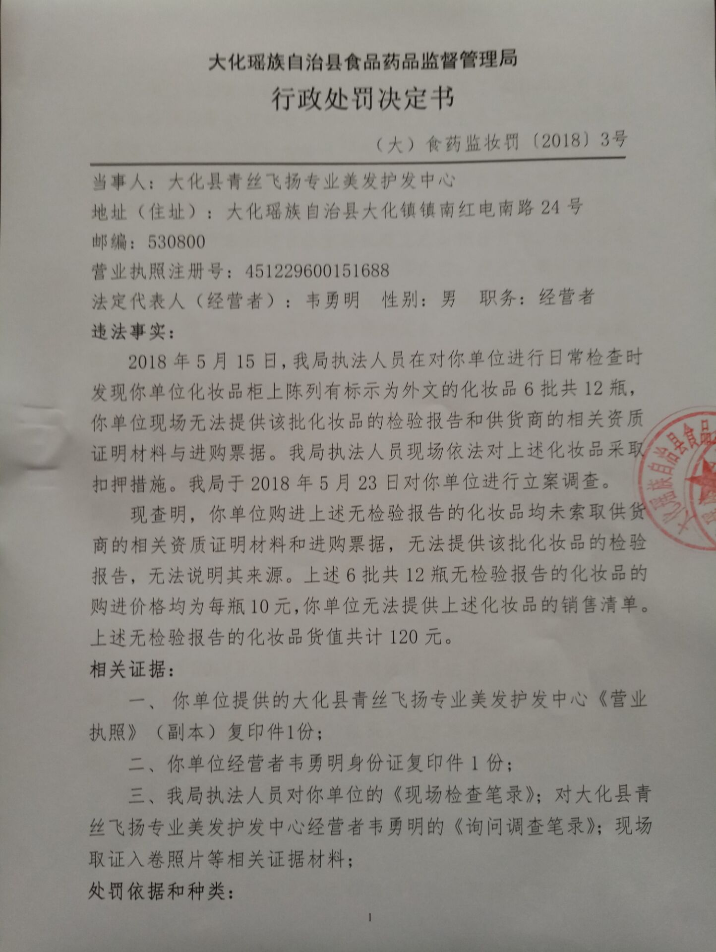 大化县青丝飞扬专业美发护发中心销售无检验报告的化妆品案 |